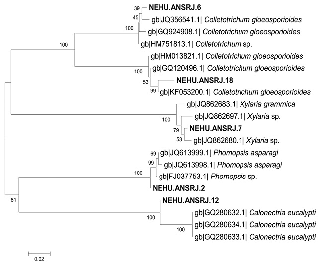 Isolation of endophytic fungi: In this study, a total of five endophytic fungi, three from the stems and two from the roots of the ethnoveterinary plant (C. gigantea), and were isolated based on morphological characteristics. The endophytic fungi were identified as Phomopsis asparagi, two strains of Colletotrichum gloeosporioides, Calonectria eucalypti and Xylaria sp. (Fig. 1). All the endophytic fungi were isolated from leaves, except P. asparagi which was isolated from the stem. The fungal isolates were further characterized based on the analysis of the phylogenetic relationship of the isolates using ITS region gene sequences. The ITS gene sequences of all the fungal isolates were submitted to NCBI GenBank and accession numbers were obtained (KF928280, KF928284, KM282291, KF928290 and KF928285).