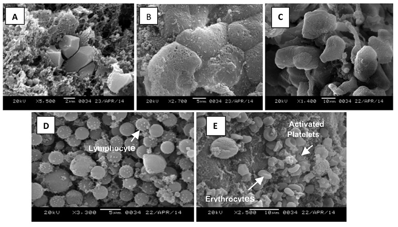 Fig. 3. (A) Scanning electron micrographs of liver cells of normal control mice showing smooth hepatocytes. (B) Mice infected with C. albicans showing rough and disintegrated cell surface of hepatocytes. (C) Treated group of mice (100 mg/kg body wt.) showing presence of both normal and disintegrated hepatocytes. (D) (E) Treated group of mice (250 mg/kg body wt.) showing presence of lymphocytes and activated platelets along with erythrocytes.