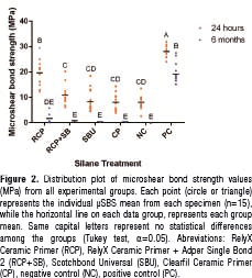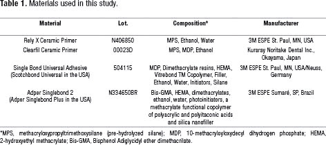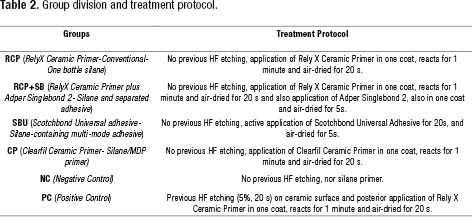 Afterwards, plaques were randomly assigned to one of the following groups (n=30) to be treated as follows: : (1) RCP-RelyX Ceramic Primer® (one-bottle silane), (2) RCP+SB-RelyX Ceramic Primer and Adper Singlebond2® (silane plus separated adhesive), (3) SBU-Scotchbond Universal® (silane-containing universal adhesive), (4) CP-Clearfil Ceramic Primer® (silane/MDP primer), (5) NC-no-silane (negative control) and (6) PC-Previous HF etching (5%, 20s) plus RelyX Ceramic Primer® (positive control). All treatment protocols for each experimental group are described on Table 2.