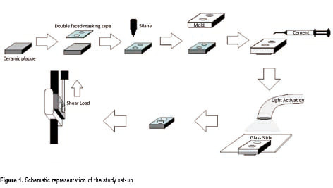 Lithium disilicate glass-ceramic (IPS e-max CAD/CAM, Ivoclar, Vivadent, NY, USA; Lot. N76665) was used along with one resin cement (Rely X Ultimate, 3M ESPE, ST. Paul, MN, USA; Lot. 505370) and three silane primers (Table 1). The specimen preparation methodology for the microshear bond strength test (µSBS) was adapted from the one developed by Shimada et al. [11]. A schematic representation of the study set up, is shown on Figure 1.