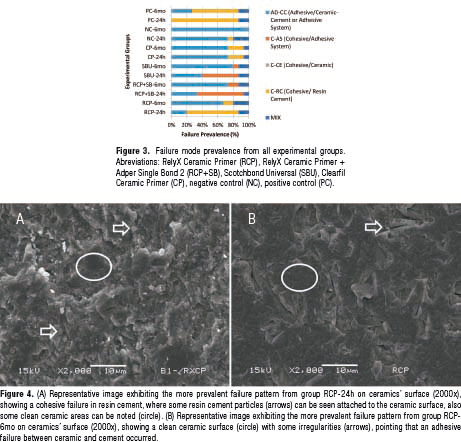 Although there is a general consensus on literature regarding the proper glass-ceramic surface treatment, some authors found that hydrofluoric acid etching is not necessary to improve ceramic/cement bonding. Shimada et al. [11], Aida et al. [12] and Hooshmand et al. [13] found that HF etching did not improve ceramic/cement bonding, stating that just silanization of ceramics’ surface may be enough to achieve a strong and long-lasting bonding. Additionally, one of the primers tested on this study (CP) does not recommend performing HF etching on ceramics’ surface before its application, as HF may be considered as a hazardous substance in some countries [10]. However, in the present investigation, only RCP produced statistically higher bond strength values when compared with the control group (NC) after 24 hours storage. No other primer tested, improved ceramic/cement bonding, not even CP which is recommended to be used without HF. This may be because RCP which is a conventional one-bottle silane, may have created strong chemical links between ceramic and resin cement, enough to improve ceramic/cement bonding performance after 24 hours storage. Curiously, RCP+SB did not improve ceramic/cement bonding, even that this treatment employed the same silane primer as RCP group, which was the only treatment capable to achieve higher bond strength values than NC. The only difference between RCP and RCP+SB is the application of an adhesive system layer after silane coating. This treatment was employed in the present study (RCP+SB), as it is also recommended as ceramic surface treatment, as previous works found some benefits provided by adhesive coating on the ceramic surface, such as improved bond strength and wetting of the resin cement and stress absorbance [21-24]. In the present study, this technique did not improve ceramic-cement bonding, probably because adhesive acted as intermediate material between ceramic and resin cement, being the weakest element of the system. Adhesives normally contain lower filler particle concentration than resin cements [25,26], reason why they (adhesives) may show lower mechanical properties. In the case of RCP, the failure occurred within the resin cement layer (Fig. 4A), conversely, on RCP+SB, it occurred along the adhesive layer (Fig. 5A), leading RCP+SB system to fail at lower load values than RCP.