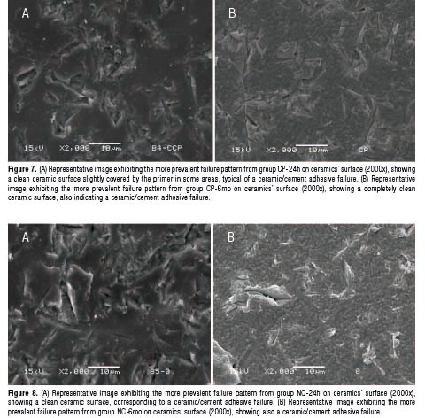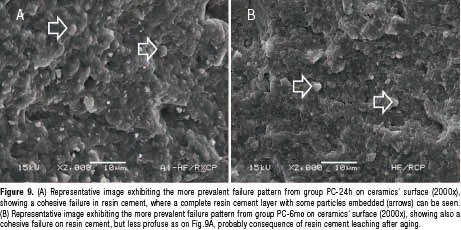 This scenario was worse after 6 months water storage, as not even RCP improved ceramic/cement bonding. Only PC (gold standard treatment) succeeded on this task (Table 3, Fig. 2). Reason why it is likely to think that HF etching synergic effect is fundamental on powering silane action through time. Without an intimate contact or improved surface energy (provided by HF etching), silane primers alone, are not able to provide enough bond strength to integrate resin cement with ceramic surface. This can be confirmed with failure pattern analysis, as a huge prevalence of adhesive failure between ceramic and cement was noted on all groups stored by 6 months (Fig. 3, 4B, 5B, 6B, 7B and 8B), with the only exception of the only group employing HF and silane together (PC), which maintained the same failure pattern observed after 24 hours storage. Being low number of irregularities (normally produced by HF etching) on ceramic surface to produce mechanical interlocking between resin cement and glass-ceramic, lower bond strength may be expected after water ageing, even when using a silane primer.