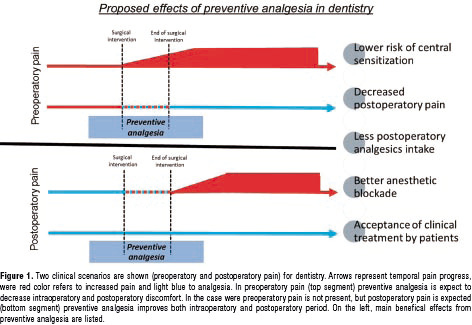 In conclusion, the preventive analgesia is a reasonable approach to control postoperative pain. The main factors related to achieve preventive analgesia are the potency of the analgesic drugs, the coadjutants of the analgesic therapy (multimodal analgesia), the posology of the drug regimen, the conditions of the clinical treatment, and the complete follow-up period (that means, the preoperatory stage, the transoperative stage and the postoperatory conclusion). If these factors are fulfilled, then effective preventive analgesia can be expected. However, from available studies we also learned that specially in dentistry, high quality evidence is still needed to confirm this clinical effect.