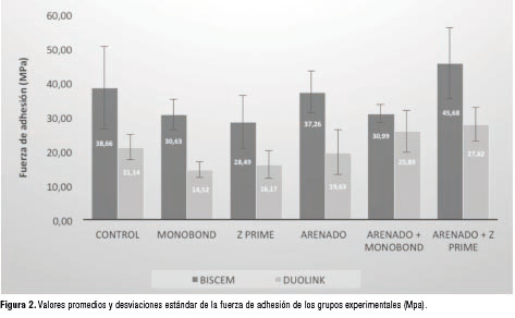Los resultados obtenidos al evaluar la fuerza de adhesión utilizando el cemento Duolink™, muestran que el tratamiento que mostró la mayor fuerza de adhesión fue el grupo tratado con arenado + primer (27.82±4.79) y el de menor fuerza de adhesión fue el tratado solamente con silano (14.52±2.21). Al comparar entre grupos experimentales se encontró diferencia estadísticamente significativa entre el grupo donde solo se aplicó silano y el grupo tratado con arenado + silano (25.89±6.03), y entre el grupo de silano y el grupo de arenado + primer.