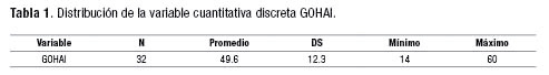 La tabla 1 muestra la distribución de la variable cuantitativa discreta GOHAI, la variable dependiente de este estudio. Se muestra el total de participantes (N=32), su promedio (49.6), su desviación estándar (12.32), el puntaje mínimo obtenido (14) y el puntaje máximo obtenido (60).