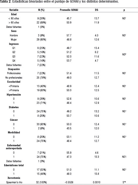 La tabla 2 muestra los resultados de las estadísticas bivariadas entre la variable cuantitativa discreta GOHAI y los distintos determinantes analizados en este estudio. La edad se presenta como una variable cualitativa dividida en dos categorías, las personas de 80 años o más reportaron una mejor CVRSO (promedio=50.9) que las personas menores de 80 años (promedio= 45.7). Con respecto al sexo, los hombres reportaron una mejor CVRSO (promedio=57.7) comparativamente a las mujeres (promedio=48.8), sin embargo, es importante notar que la cantidad de hombres es muy reducida (N=3). Para la variable ingresos, se observó una mejor CVRSO a mayor cantidad de ingresos. La ocupación, mostró que los profesionales reportaron una mejor CVRSO (promedio=51.4) en comparación con los no profesionales (promedio=49.1). Para el nivel de escolaridad, las personas con escolaridad mayor a primaria reportaron mejor CVRSO (promedio=50.0) respecto a aquellas personas con escolaridad igual o menor a primaria (promedio=48.9. Con respecto a la morbilidad, las personas con hipertensión reportaron peor CVRSO (promedio=48.4) que las personas que no padecen la enfermedad (promedio=52.6). Con respecto a la diabetes ocurrió lo contrario; las personas con diabetes reportaron una mejor CVRSO (promedio=50.7) que las personas que no padecen la enfermedad (promedio=49.2). En cuanto a la variable cáncer, las personas que reportaron haber sufrido cáncer presentaron en promedio una peor CVRSO (promedio de personas con cáncer=43.5/Promedio personas sin cáncer=50.0). En general, cualquier estado de morbilidad aumenta en promedio las probabilidades de declararse con una peor CVRSO. Para la variable de edentulismo, las personas edéntulas totales reportaron peor CVRSO (48.0) que aquellas personas sin esta condición (51.0). Con la variable de xerostomía, se reveló una relación estadísticamente significativa entre el puntaje de xerostomía y el puntaje de GOHAI; lo que indica que en promedio un aumento de la sensación de sequedad bucal se relaciona con peores promedios de CVRSO (rho=-0.55, p=0.0010). En cuanto al consumo de medicamentos, las personas que consumen antidepresivos declararon en promedio una peor CVRSO si se les comparaba con aquellos que no consumen este medicamento (promedio de personas con antidepresivos=48.3/promedio de personas sin antidepresivos=54.6). Las personas que consumen antipsicóticos, declaran en promedio una peor CVRSO si se les compara con aquellos que no consumen este medicamento (promedio de personas con antipsicóticos=50.0/promedio de personas sin antipsicóticos= 52.6). Las personas que consumen analgésicos, reportan peor CVRSO (promedio=49.8) que aquellas que no los consumen (promedio=53.5). De igual forma, las personas que consumen antihipertensivos reportan peor CVRSO (promedio=50.2) que aquellas personas que no consumen este medicamento (51.3). En general, el consumo de medicamentos se relaciona con promedios más bajos de CVRSO. Con respecto a los comportamientos de salud, se observa que las personas que han fumado declaran mejor CVRSO (promedio=56.7) que aquellas que no lo han hecho (promedio=47.61). Para la variable deporte, las personas activas físicamente activas reportan mejor CVRSO (promedio=51.30) que aquellas personas que no realizan actividad física (promedio=47.98). En cuanto a las meriendas, aquellos que nunca las toman reportan mejor CVRSO que aquellas personas que las realizan alguna vez (promedio de personas que toman merienda=46.89/promedio de personas que no consumen merienda=58.14). Finalmente, se analizaron los datos de la variable consumo de azúcares y se clasifica según el nivel de consumo: bajo (promedio=48.59), medio (promedio=44.15) y alto (promedio=50.52). En promedio, se observó una mejor CVRSO entre mayor reporte de consumo de azúcares tenía la persona.