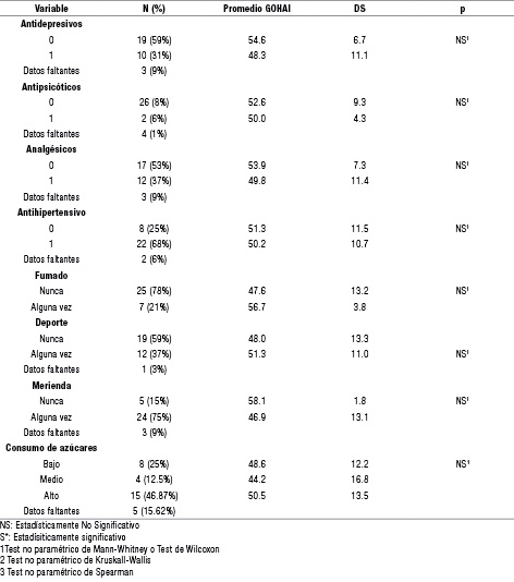 Otra de las variables analizadas en este estudio es el consumo de medicamentos. En general, el consumo de medicamentos se relaciona con promedios más bajos de CVRSO relacionada con la salud bucal. Se incluyeron en este estudio medicamentos como antihipertensivos, antipsicóticos, analgésicos y antidepresivos, lo cuales no resultan de significancia estadística.
