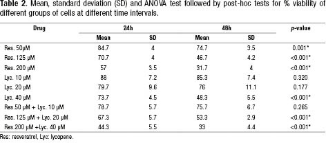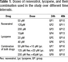 Methyl Thiazol Tetrazolium (MTT) assays were used to assess cell viability after treatment with different doses of resveratrol and lycopene separately and in combination for 24 and 48h. Doses were higher and lower than the IC50 of both extracts, as calculated in previous studies (4,7) (Table 1).