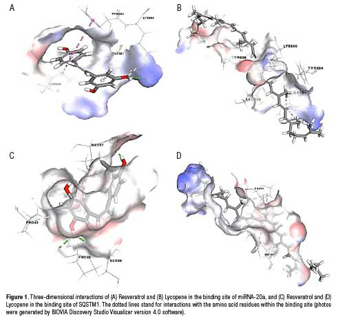 Molecular docking in the current study predicted favorable negative binding energies and binding interactions for both resveratrol and lycopene with binding sites of miRNA-20a and SQSTM1. Resveratrol showed more affinity toward both miRNA-20a and SQSTM1, consistent with the biological evaluation.