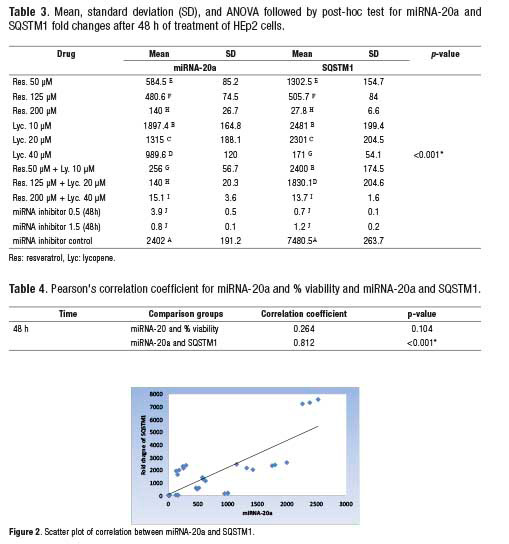 Both resveratrol and lycopene are cytotoxic to HEp-2 cells, in a dose- and time-dependent fashion. Cytotoxicity of resveratrol is more pronounced than lycopene at different doses and time intervals. A combination of a resveratrol/lycopene mixture shows greater cytotoxicity when compared with lycopene alone. Resveratrol and lycopene reduce expression of miRNA-20a and levels of its target, SQSTM1, in a dose-dependent manner. Combined resveratrol-lycopene exposure showed no statistically significant difference in miRNA-20a and SQSTM1 expression compared with resveratrol alone. Finally, miRNA-20a and SQSTM1 levels were directly related, indicating a direct linkage. Decreasing expression of miRNA-20a and SQSTM1 induced a decrease in levels of autophagy and an increase in apoptosis in HEp-2 cells.