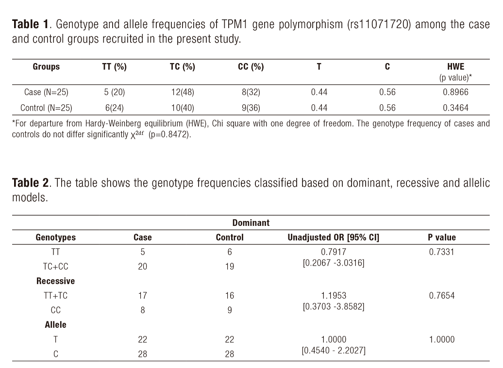 Existing studies on the influence of TPM1 gene in the development of non syndromic cleft lip and palate have established some association between a few SNP and NSCL/P in different ethnic population (23-26). SNPs rs1972041GA, rs197204, rs11071720, rs3803499, rs 1873147 and rs12148828 were studied in the Chinese population for its influence in the development of NSCL/P (24, 25). SNPs rs11071720, rs12148828, rs3803499 and rs1972041 have been evaluated for association NSCL/P in the Iranian polymorphism (23). European-descent population-based studies found significant associations between isolated cleft lip only and fetal SNPs near TPM1 gene (26). However, the role of TPM1 gene in the development of cleft lip and palate in the South Indian population has not been reported in literature.