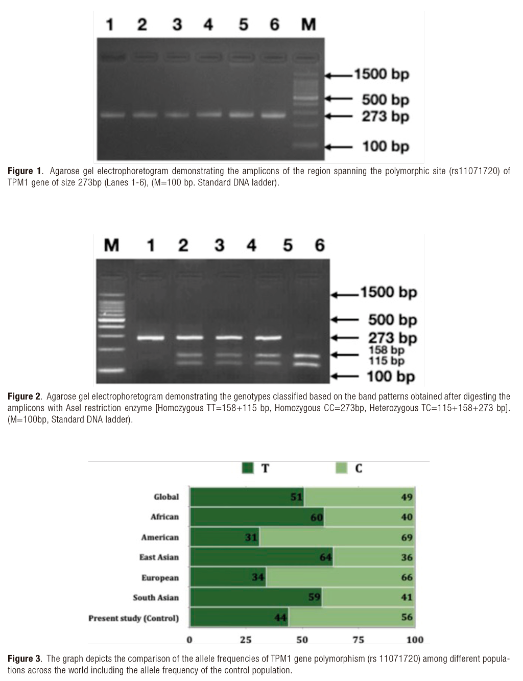 TPM1 gene (rs1107171) polymorphisms were assessed by polymerase chain reaction (PCR) amplification and restriction digestion. Amplification of DNA spanning the rs11071720 polymorphic site of the TPM1 gene was done using PCR. The forward primer was 5’-TACGGGGTTGTTCTGAGTTGAG- 3’ and reverse primer was 5’-CTAGCGAGTAAGGGAGTCGGA-3’. The amplification of DNA was performed in 20 µL volumes using 10 ng of genomic DNA, 5 pmol/µL, each of the forward and reverse primers along with PCR Master Mix (Takara, Shiga, Japan). The cycling conditions were as follows: initial denaturation at 94°C for 5 minutes, denaturation at 94°C for 35 seconds, annealing at 60°C for 35 seconds, extension at 72°C for 35 seconds and a final extension at 72°C for 5 minutes. A 5µL volume of PCR product was checked on a 1% agarose gel, and 15µL of PCR product was digested using a restriction enzyme AseI (New England Biolabs, Hitchin, UK). Digestion was carried out at 37°C for 2 hours. The digested product was visualized on 2% agarose gel.