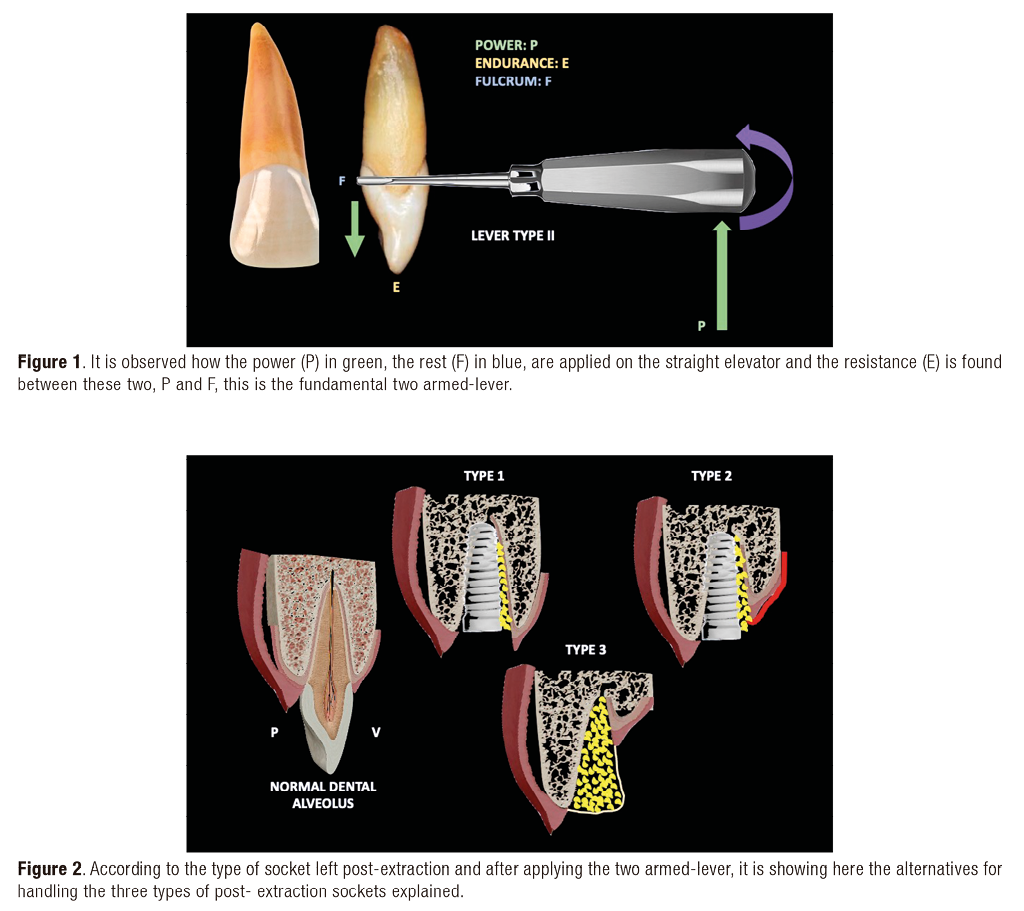 A useful tool to preserve the alveolar bone regeneration keeping in mind the classification of extraction sockets proposed by Elian et al. (2007)(1), an excellent strategy for using the two armed-lever with a straight elevator, which consist in (Figure 1):
