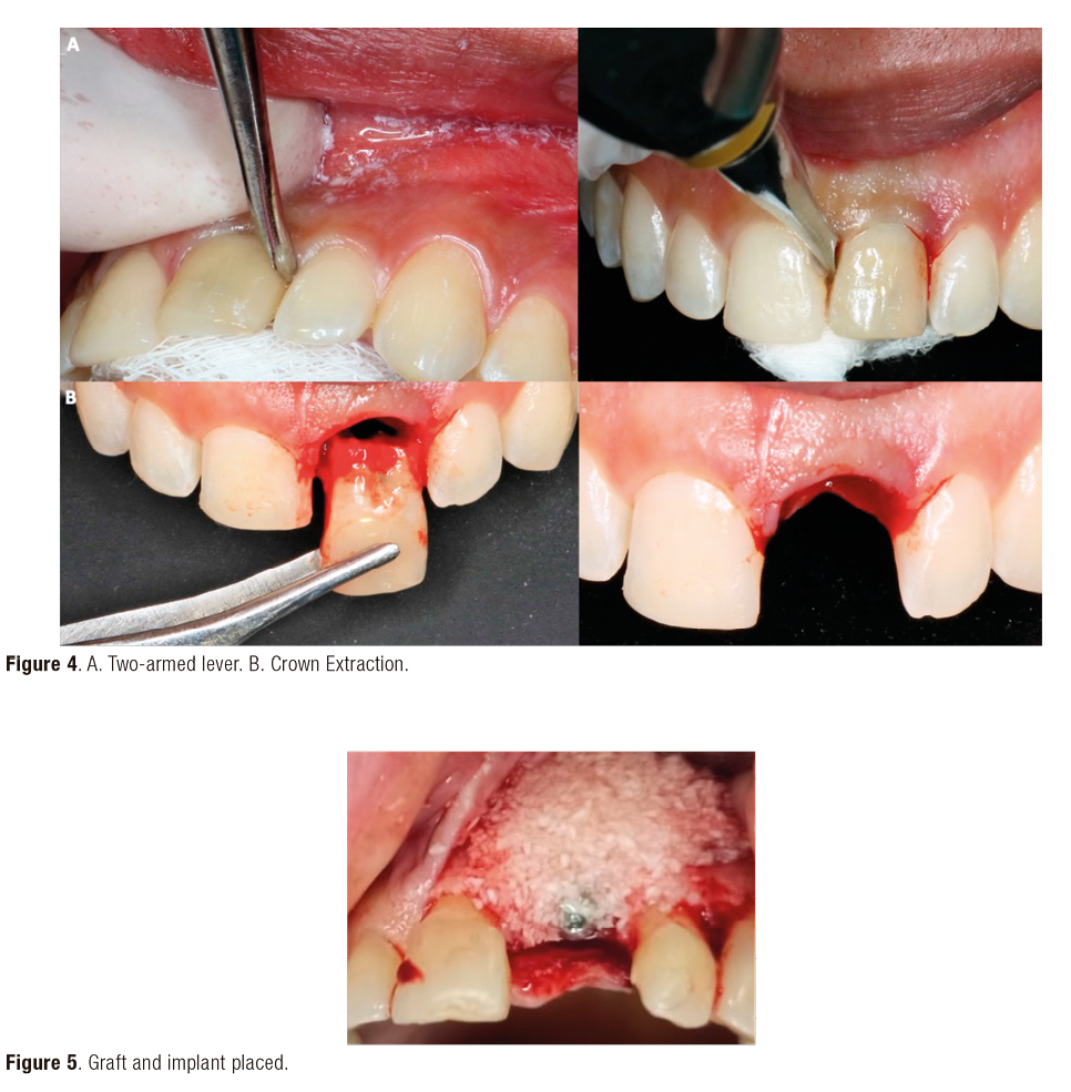 A 24-year-old male patient who required extraction of the upper left central incisor due to a corono-radicular fracture, reason for which is requested, panoramic radiography and cone beam, in which, as in the immediately previous case, the extraction was planned using a two-armed lever as an atraumatic alveolar preservation technique. During the clinical examination, it was observed at the level of the upper left central incisor, resin filling of 4 surfaces and slight redness was evident at the gingival margin (Figure 3.A and Figure 3.B). The extraction procedure was initiated by applying the strength of the two-arm lever, the straight elevator is in a horizontal position resting on the mesial and distal surfaces have the greatest possible palatal rest and resistance in the mesial and/or disto-vestibular areas; that generates an extrusive dental dislocation that combined with the vestibular palatine grip with the left hand helps to avoid compromising the vestibular table, then it is produced in the first instance, tooth crown extraction (Figure 4.A and Figure 4.B), by the corono-radicular fracture already mentioned, then its proceed to the dental root´s extraction, using lever of the second degree, without compromising the vestibular and palatal tables. Once confirmed the integrity of the vestibular wall and the gingival biotype: type I socket, 1cc of Puros® particulate cortical bone (250-1000 microns) is used for the graft. Subsequently, Zimmer TSV 3.7 * 13mm implant was placed (Figure 5). The implant was prepared and placed 2.5mm from the gingival margin to achieve primary fixation, a surgical cover screw was placed, the cavity was occluded with a collagen membrane (CollaTape®) and sutured transverse and horizontally with acid polyglycolic 5-0, followed by a provisional restoration, finally, the patient is prescribed oral capsules of dicloxacillin 500mg and nimesulide tablets orally 100mg. After five months of clinical and radiographic controls, the second phase begins. The patient received a metallic ceramic crown with functional and aesthetic results after 18 months of continuous controls.