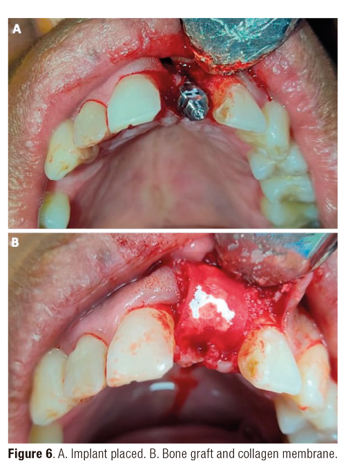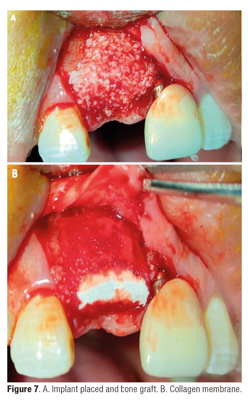 A 36-year-old male patient who required extraction of the upper left central incisor due to radicular-crown fracture as the anterior case, finding a type II socket with a dehiscence of 25% by this reason it is decided follow the protocol to the extraction procedure initiated by applying the strength of the two-arm lever, then 1cc of puros particulate cortical bone (250-1000 microns) is used for the graft. Subsequently implant was placed (Figure 6.A and Figure 6.B).