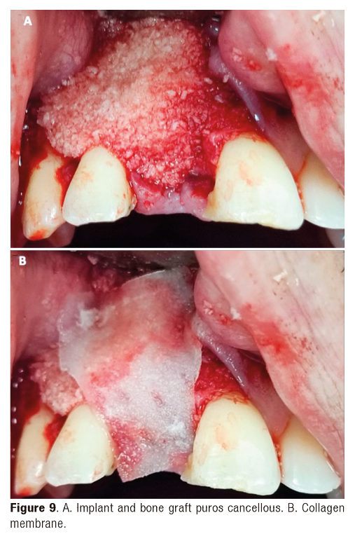 A 36-year-old male patient who required an extraction of the upper right central incisor finding a type II socket with a dehiscence of 50% associated to thick biotype by this reason is chosen an immediate implant placement with bone graft puros cancellous and resorbable membrane adjacent to provisional tooth (Figure 9).