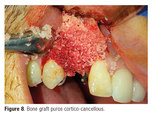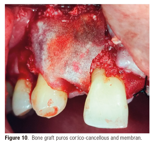 A male patient in sixth decade of life who presented a type III socket with a dehiscence <75% with thin biotype by this reason it is decided to bone regeneration with puros, cortico-cancellous bone and membrane (Figure 10).