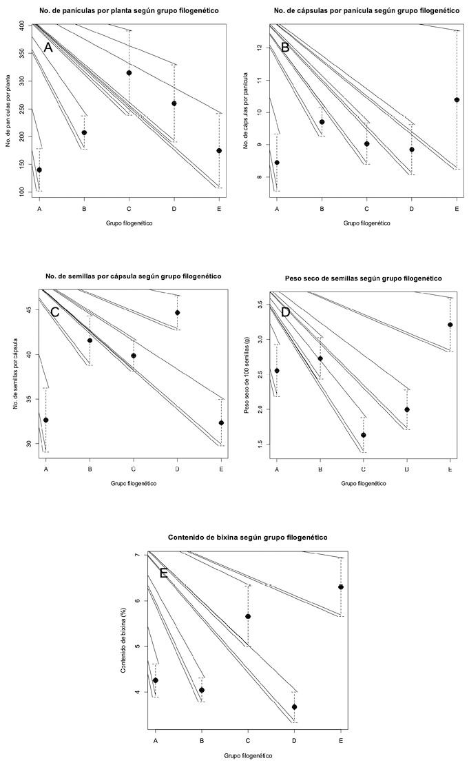Figura 4. Relación entre grupos filogenéticos y las variables: A. Número de panículas por planta. B. Número de cápsulas por panícula. C. Número de semillas por cápsula. D. Peso seco de 100 semillas (g) E. Contenido de bixina.