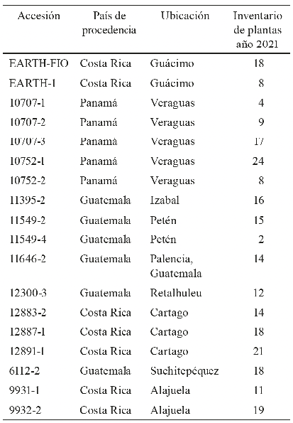 Tabla 1. Procedencia e inventario de plantas (año 2021) de las distintas accesiones existentes en el Banco de Germoplasma de la Universidad EARTH.