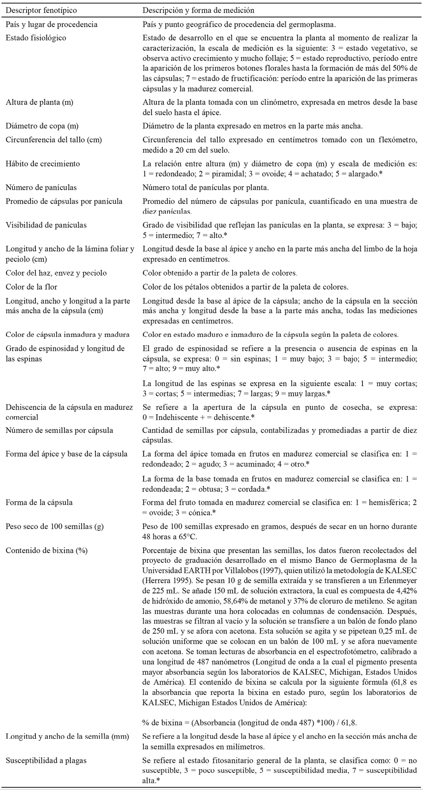 Tabla 2. Descriptores fenotípicos utilizados para la caracterización del Banco de Germoplasma de Achiote de la Universidad EARTH.