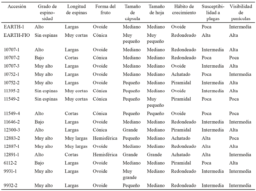 En general el banco de germoplasma cuenta con diferentes materiales que presentan rasgos fenotípicos contrastantes por lo que este estudio sirve como base para poder iniciar con programas de mejora del cultivo.