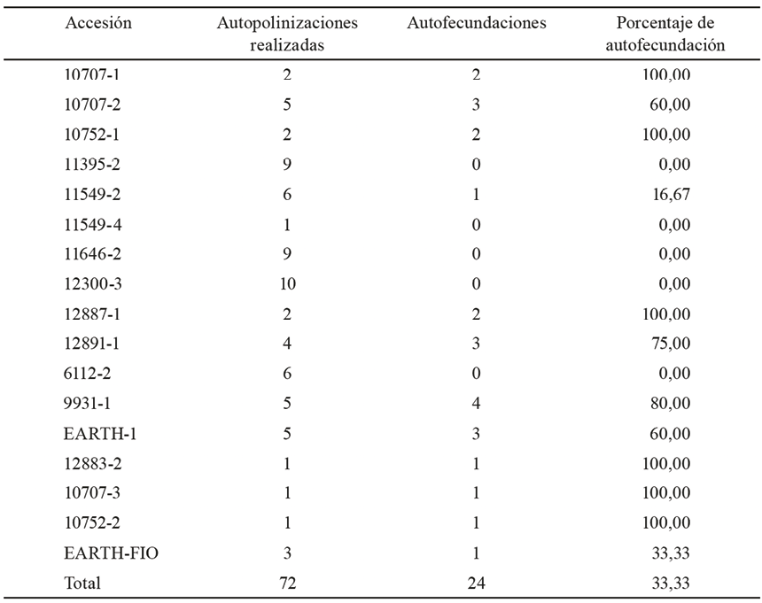 Análisis de autopolinizaciones. Los resultados de los ensayos de autopolinización mostraron en promedio 33,33% de fecundación del total de 72 autopolinizaciones realizadas en 17 accesiones de achiote. En 4 (11395-2, 11646-2, 12300-3 y 6112-2) no fue posible obtener ninguna autofecundación con éxito, a pesar de ser en las que más se realizaron ensayos (Tabla 4) lo que se puede relacionar con una autoincompatibilidad genética, pues es conocido que el achiote es una especie alógama con tasas de polinización cruzada de 57% y tasas de autopolinización de 37,5% (Rivera y Flores 1988).