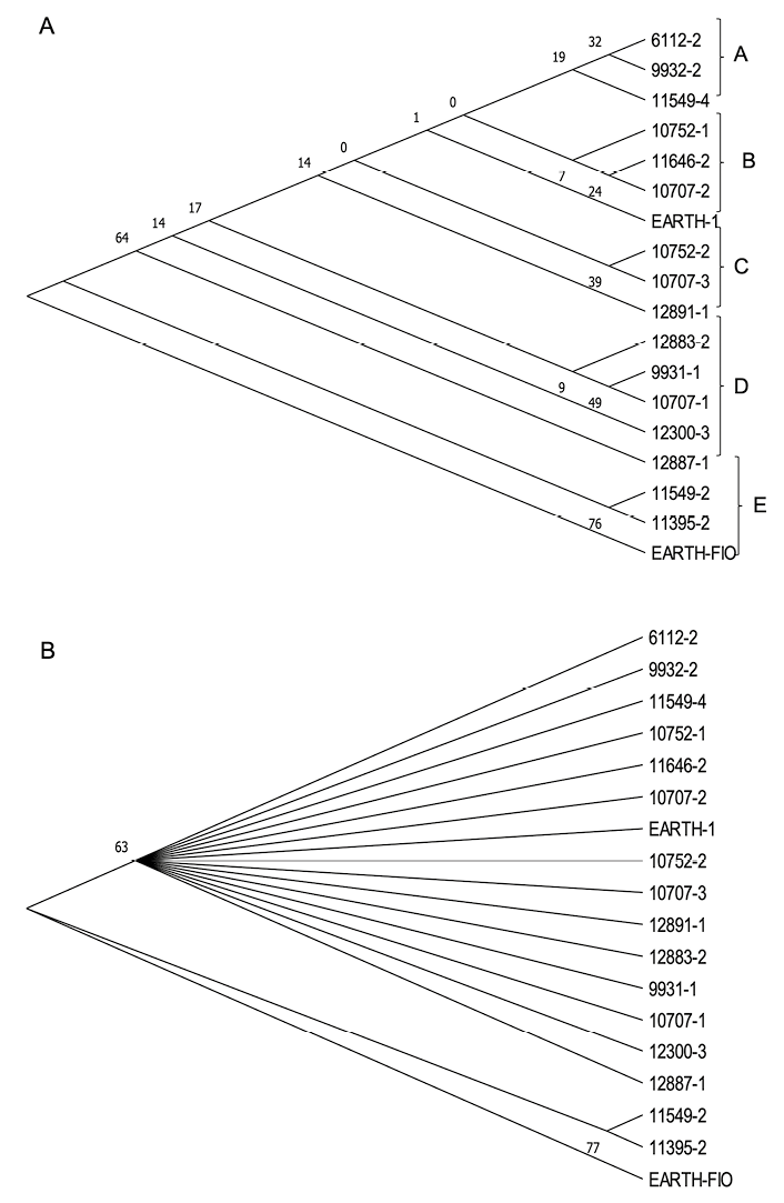 Figura 3. A. Dendrograma Maximum Parsimony (MP) de la región ITS2 del Banco de Germoplasma de Achiote de la Universidad EARTH. B. Dendrograma MP condensado al 50% de la región ITS2 para las 18 accesiones del Banco de Germoplasma de Achiote de la Universidad EARTH.