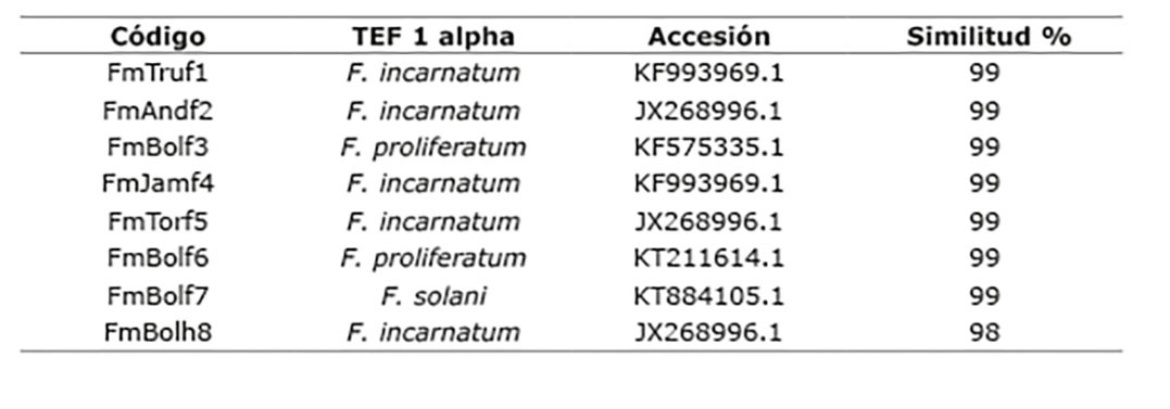 Para determinar la identidad genética o la especie de los ocho aislamientos, las secuencias fueron analizadas y comparadas en las bases de datos del NCBI (National Center for Biotecnology Information) por BLAST (Basic Local Alignment Search Tool) y en la base de datos Fusarium ID.