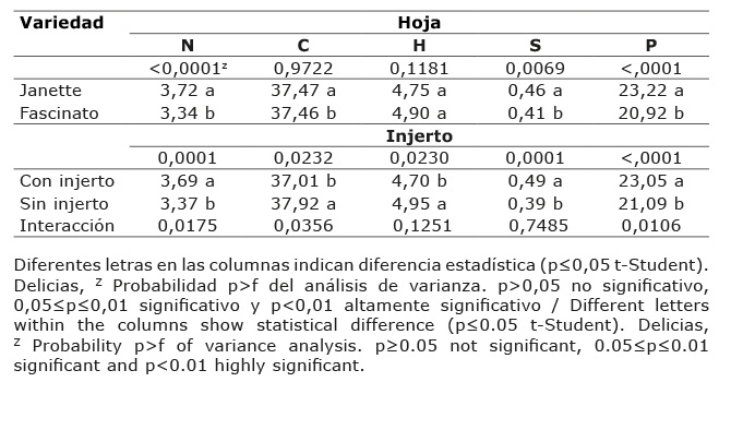 En el Cuadro 3, se muestran los datos obtenidos en N, C, H, S y proteína, en pedúnculo, los cuales no mostraron diferencias significativas entre tratamientos (p≤0,05). La variedad Janette fue significativa en el contenido de N en el pedúnculo, y la variedad Fascinato presentó el valor más alto en C, a diferencia del H, S y proteína. En relación con el injerto no hubo diferencias en las variables de C, H, S y proteína. Se menciona que los frutos son los principales órganos sumidero de asimilados, el peso acumulado de los frutos representa entre el 50 y 60% del peso seco total (Peil y Gálvez, 2005), sin embargo, la distribución momentánea del incremento de la materia seca entre los frutos y parte vegetativa puede cambiar de manera cíclica, el cual parece mantener una relación lineal con el peso total de la planta.