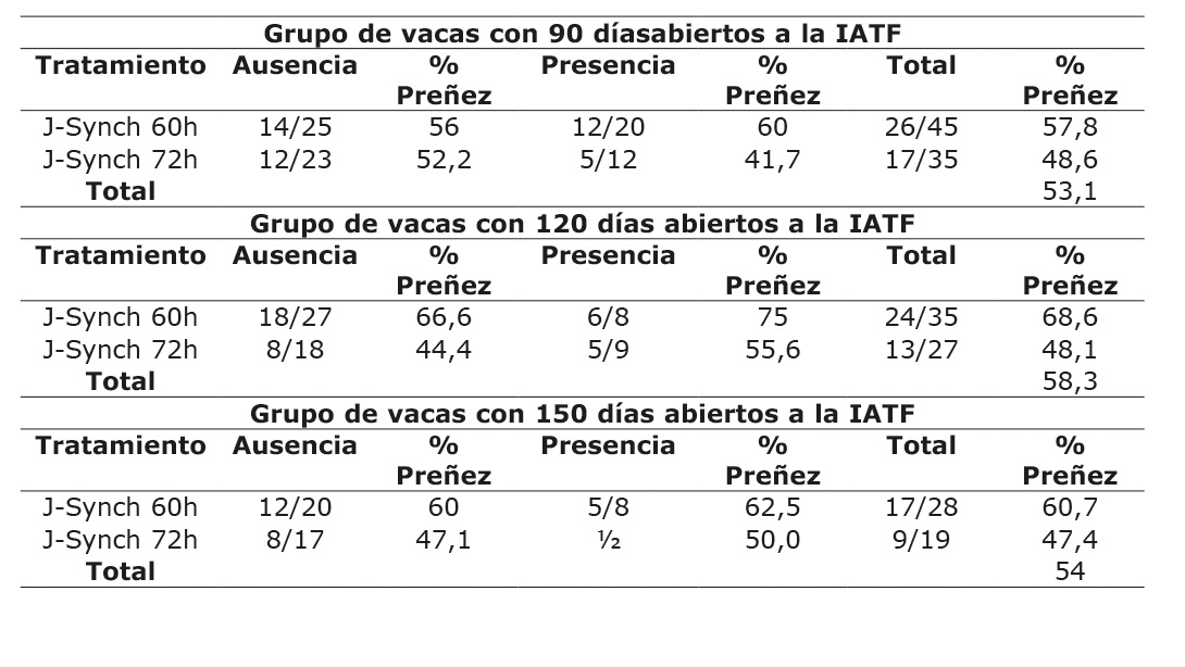De las vacas que manifestaron celo, la tasa de preñez para T1 fue del 62% (54/87) y del T2 fue del 50% (36/72), los cuales no mostraron diferencia significativa, al igual que las vacas sin presencia de celo, que fueron 57,1% (16/28) y 41% (16/39) (p=0,401, p≥0,526) para T1 y T2, respectivamente (Cuadro 2).