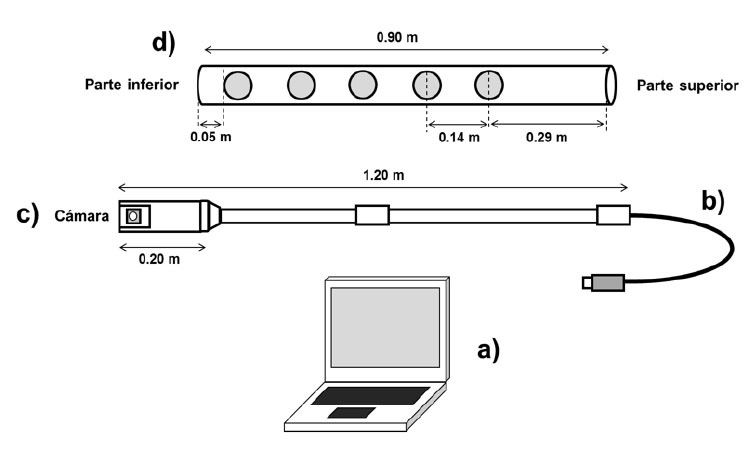Figura 1. Minirrizotrón elaborado a bajo costo para el muestreo de raíces de maíz, el cual está conformado por: a) receptor de imágenes (computadora portátil); b) endoscopio (hecho con PVC); c) difusor (cámara web comercial con leds) y d) pared del minirrizotrón (elaborado con PVC hidráulico).
