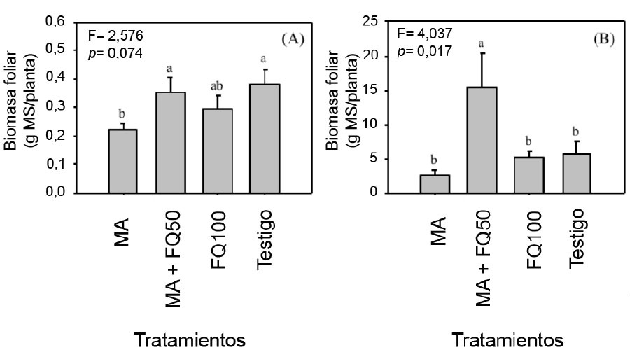 La biomasa foliar al inicio del periodo experimental (30 DDS), presentó diferencias significativas entre los tratamientos (p =0,05), debido a que, el Testigo y MA+FQ50% produjeron mayor cantidad de biomasa (4,13 y 3,374 g MS/planta), en comparación con MA y FQ100% (2,411 y 2,503 g MS/planta) (Figura 3). La biomasa foliar al final del periodo experimental (90 DDS), fue diferente entre los tratamientos (p =0,05), donde MA+FQ50% presentó mayor cantidad de biomasa de forma significativa (63,157 g MS/planta), en comparación al tratamiento MA, FQ100% y Testigo con 19,38 g MS/planta, 31,142 y 36,148 g MS/planta, respectivamente (Figura 4).