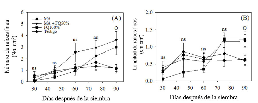 Figure 6. Number (A) and length of fine roots (B) in VS-536 corn crop with treatments mycorrhiza and Azospirillum (MA), mycorrhiza and Azospirillum + chemical fertilizer 50% (MA + FQ50%), chemical fertilizer 100% (FQ100%) in doses of (142–70–00 kg/ha) and a control in a Luvisol soil, at 30, 45, 60, 75, and 90 days after sowing, from October 2014 to January 2015 in the south of Quintana Roo, Mexico. ns = not significant; o = p≤0,05.