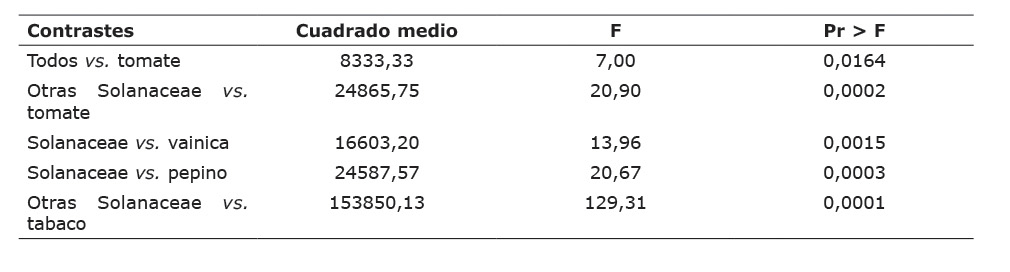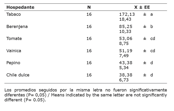 Los datos se sometieron a un análisis de varianza de parcelas divididas, donde los tratamientos (hospedantes) se consideraron como la parcela principal y el tiempo (fechas) como las sub-parcelas. Las medias fueron comparadas mediante la prueba de Tukey (SAS Institute, 1985), con un nivel de significancia de 0,05. Asimismo, se realizaron los siguientes contrastes ortogonales: tomate vs. resto de tratamientos, tomate vs. resto de Solanaceae, todas las Solanaceae vs. vainica, todas las Solanaceae vs. pepino, tabaco vs. resto de Solanaceae (SAS Institute, 1985).