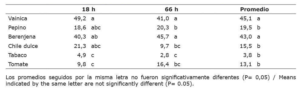 En el experimento efectuado en Florida, los números de adultos en el tabaco fueron los más bajos de todos los hospedantes, aunque no difirieron (p>0,05) del tomate, el chile dulce y el pepino a las 18 h, ni tampoco de los dos primeros a las 66 h (Cuadro 3). Además, a las 66 h bajó el número de adultos en un factor de dos en el tabaco y el chile dulce, mientras que, subió en un factor casi equivalente en el tomate. Los hospedantes más preferidos por los adultos fueron la vainica y la berenjena, los cuales no difirieron entre sí (p>0,05), pero lo hicieron del resto de los tratamientos tanto a las 66 h como al considerar el promedio general; dichos tratamientos no difirieron entre sí en cuanto al promedio general.