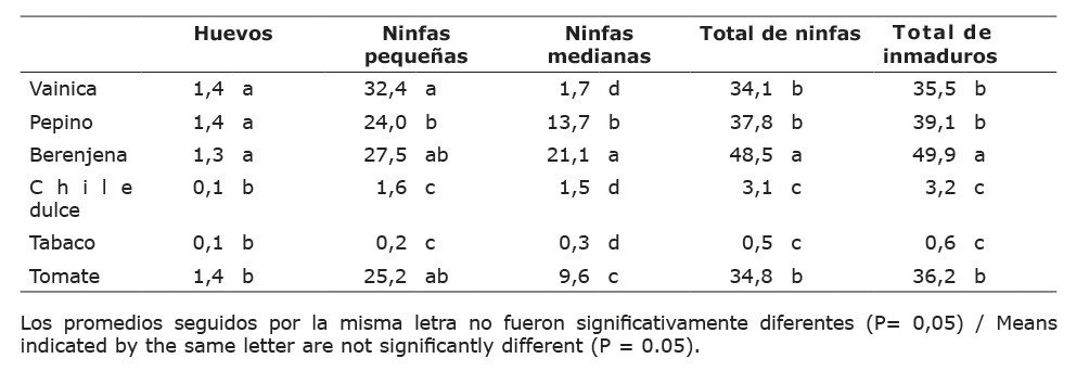Estas tendencias se mantuvieron para las formas inmaduras. En efecto, en el tabaco y el chile dulce se observaron menos huevos y ninfas de los dos tamaños o edades, en comparación con los demás hospedantes (Cuadro 4). En cuanto a los otros hospedantes, no hubo diferencias entre ellos, en relación con los huevos, pero sí con las ninfas pequeñas en vainica, en comparación con el pepino. Sin embargo, hubo mucho menos ninfas medianas en tabaco, chile dulce y vainica, seguidos por el tomate, pepino y berenjena. El número de ninfas grandes sumamente bajo en la vainica sugiere que el desarrollo del insecto era lento en este hospedante o, más aún, que muchas de ellas mueren antes de convertirse en adultos.