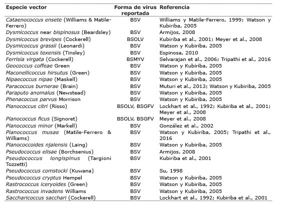 Se ha determinado que las especies de cochinillas harinosas D. brevipes, Pl. citri, Pl. ficus y P. longispinus, presentan capacidad para transmitir el episomal de la raya del banano (BSOLV) al banano cv. Williams (subgrupo Cavendish, AAA) (Meyer et al., 2008). Se evidenció que en invernadero el BSV es transmitido por la cochinilla harinosa de los cítricos Pl. citri; y la cochinilla harinosa S. sacchari es transmisora del virus Badnavirus baciliforme de la caña de azúcar (SCBV) al banano; ambas identificadas en Uganda (Harper et al., 2004). De acuerdo con lo descrito por Meyer et al. (2008), se identificó la transmisión del BSV por medio de Dysmicoccus spp. en África Occidental y América del Sur; Pl. musae en Nigeria, F. virgata en India, D. brevipes, Pl. ficus y P. burnerae en Sur África. La transmisión experimental de BSV también se ha obtenido con la cochinilla harinosa Pseudococcus comstoki (Kuwana). La transmisión del BSV en Filipinas por medio de las cochinillas harinosas P. elisae y D. brevipes, fue reportada por Sison et al. (2017); las plantas de prueba inoculadas exhibieron síntomas típicos de BSV a los 115 y 267 días después de la inoculación, y una sola infección de BSMYV provocó los síntomas más graves. Como vector del BSV del banano, Muturi et al. (2013) reportaron a P. burnerae y González et al. (2002) a Pl. minor. Varias especies de cochinillas se han mencionado como vectores del virus del racimo del banano (Banana bunchy top virus, BBTV) en Filipinas: D. brevipes, D. neobrevipes, R. invadens, N. nipae y Planococcus sp. (Navasero, 2008).