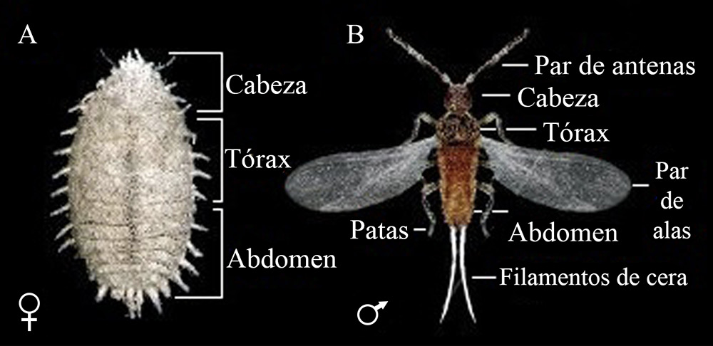 La cochinilla hembra adulta presenta un cuerpo de consistencia blanda, el tamaño y color del cuerpo varían de acuerdo con la especie; la forma puede ser alargada, ovoide o casi circular. Sobre la superficie tergal puede verse la segmentación del cuerpo, pero no se nota una diferencia entre cabeza, tórax y abdomen (Figura 1A). Sin embargo, en casi la totalidad de las especies es fácil observar un par de antenas y tres pares de patas. De acuerdo con Mani y Shivaraju (2016), la cochinilla harinosa hembra adulta puede llegar a medir hasta 8-9 mm de longitud, aunque autores como Kaydan et al. (2015) mencionaron una longitud de menos de 5 mm. Otros autores indican tamaños de aproximadamente 2,8 mm de longitud y 1,5 mm de ancho, cuando presentan forma de óvalo (Al-Helal et al., 2012); sin embargo, en otro estudio se han reportado medidas de 2,2 mm de longitud y 2 mm de ancho, que corresponde a cochinillas de forma redondeada (Palma-Jiménez y Blanco-Meneses, 2017). Para identificar al individuo a nivel de especie se utilizan las hembras adultas; los machos y ninfas carecen de las características de diagnóstico que utilizan la mayoría de las claves y guías para su clasificación (Saccaggi et al., 2008).