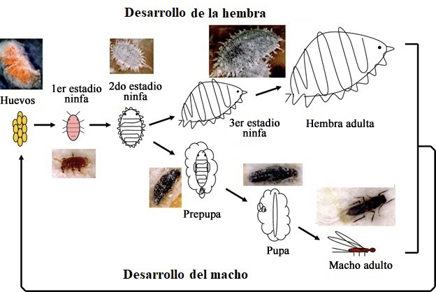 Figura 2. Ciclo de desarrollo de las cochinillas harinosas hembra y macho a partir de la formación de los huevos producto de la reproducción. La cochinilla hembra presenta cuatro estadios de desarrollo: tres estadios de ninfa y el estadio de hembra adulta. El macho presenta cinco estadios de desarrollo: dos estadios de ninfa, formación de la prepupa, formación de la pupa y el estadio de macho adulto (modificado de Kono et al., 2008).