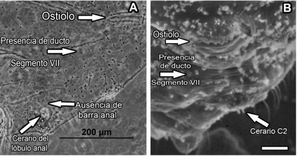 A. Through light microscopy technique, the lack of anal bar in the anal lobe cerarii, as well as the presence of the duct were observed. B. The oral rim tubular duct presence was verified by Scanning electron microscopy technique nearby the segment VII. Scale: 36,4 μm (B); (modified from Palma-Jiménez and Blanco-Meneses, 2016b).