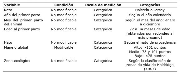 La variable dependiente fue la producción de la primera lactancia (PPL), y las variables independientes se clasificaron en cuatro categorías: asociadas al animal o al ambiente, y como modificables o no modificables. Estas últimas se refieren a la posibilidad de ser alterada, especialmente en corto plazo, por el ser humano (Cuadro 1). Dentro de esta clasificación, la variable de manejo se catalogó como modificable; las variables como edad al primer parto (EPP), raza, año, mes del primer parto y zona ecológica, según la clasificación de zonas de vida de Holdridge (1987), se clasificaron como no modificables.