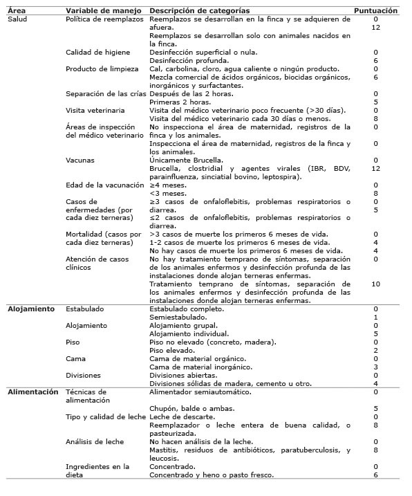 Con el fin de categorizar las fincas según su nivel de manejo (alto, medio, bajo), se utilizaron 39 variables de la encuesta, relacionadas con el manejo de los reemplazos, en donde la información se clasificó en tres grandes áreas: salud, alojamiento y manejo nutricional de las terneras (Cuadro 2).