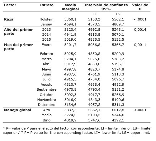 Cuadro 3. Medias marginales (e intervalos de confianza 95%) de la producción de la primera lactancia (PPL, kg) para los distintos estratos de los factores relacionados con el animal y ambiente. Estudio cohorte retrospectivo de 2747 vacas lecheras de veintidós fincas de las principales zonas lecheras de Costa Rica. Primer parto entre 2013 y 2015.