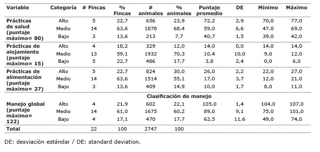 Con respecto a la sumatoria de las variables parciales en manejo global; de las 22 fincas utilizadas, cuatro se clasificaron como explotaciones con manejo alto (Media: 105 puntos; ± 1,41), 14 de manejo medio (Media: 89,07 puntos; ± 9,05), y cuatro de manejo bajo (Media: 62,50 puntos; ± 11,56), las cuales contaban con un total de 602, 1675 y 470 animales, respectivamente (Cuadro 4). Cabe mencionar que las fincas de manejo medio, tenían mayor cercanía de puntaje total a las fincas de manejo alto, que aquellas de baja calidad. Por ejemplo, las fincas de manejo global medio presentaron solo una diferencia de 16 puntos en el promedio con respecto a las fincas de manejo alto, contrario a lo observado con las bajas, que difirieron de las medias por 26 puntos.