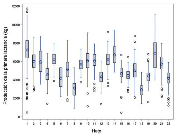Figura 1. Diagramas de caja de la variable producción de la primera lactancia (PPL) en función del hato de procedencia. Estudio cohorte retrospectivo de 2747 vacas lecheras de veintidós fincas de las principales zonas lecheras de Costa Rica. Primer parto entre 2013 y 2015.