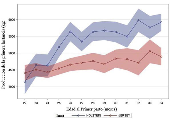 Figura 3. Medias marginales e intervalo de confianza 95% de la producción de la primera lactancia para la interacción de la variable de edad al primer parto con la raza (Jersey y Holstein). Estudio cohorte retrospectivo de 2747 vacas lecheras de veintidós fincas de las principales zonas lecheras de Costa Rica. Primer parto entre 2013 y 2015.