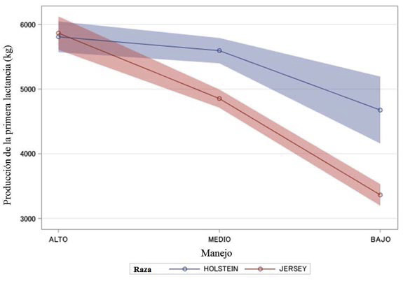 Figura 4. Medias marginales e intervalo de confianza 95% de la producción de la primera lactancia para la interacción de la variable de manejo global (alto, medio y bajo) con la raza (Jersey y Holstein). Estudio cohorte retrospectivo de 2747 vacas lecheras de veintidós fincas de las principales zonas lecheras de Costa Rica. Primer parto entre 2013 y 2015.