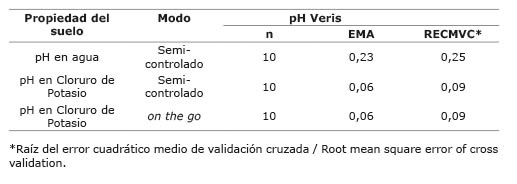 Para la validación cruzada (Cuadro 7), la precisión de los modelos de pH semi controlado y on the go fue la misma (0,09), en cambio la precisión del modelo semi controlado para pH en agua fue muy baja con 0,25 (Cuadro 6).