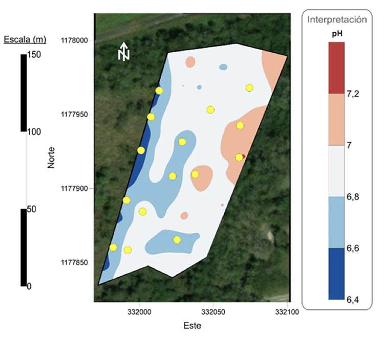 Sethuramasamyraja et al. (2008) utilizando el ion selectivo para pH, potasio soluble y nitrato residual en modo on the go, mostró un rango de r2 de 0,85 a 0,89 con sus respectivas muestras de pH laboratorio, mientras que Adamchuk et al. (2007) con el equipo Veris en modo on the go en Estados Unidos presentaron correlaciones con r2>0,5.