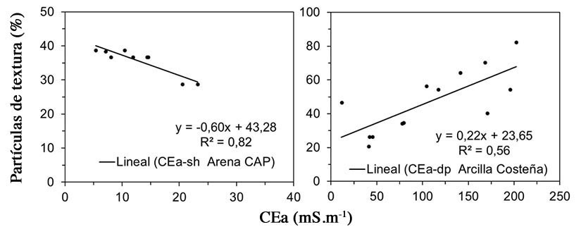 Existe una fuerte correlación entre CEa y las partículas del suelo, cuando se trata de suelos no salinos (caso del presente estudio) (Williams y Hoey, 1987). En CEa-sh al trabajar con Veris 3100, Sudduth et al. (2003) encontraron un r2 de 0,62 a 0,77 para arcilla y 0,60 a 0,79 para limo, asimismo, Sudduth et al. (2005) obtuvieron un r2 para arcilla de 0,37 a 0,63 y 0,39 para limo. Los resultados encontrados en dichas investigaciones se encuentran en el mismo rango del presente estudio. En ambos casos no se reportó correlación con arena. En investigaciones efectuadas por Sudduth et al. (2003; 2005) se obtuvieron r2 similares al del presente estudio para arcilla y limo con CEa-dp.
